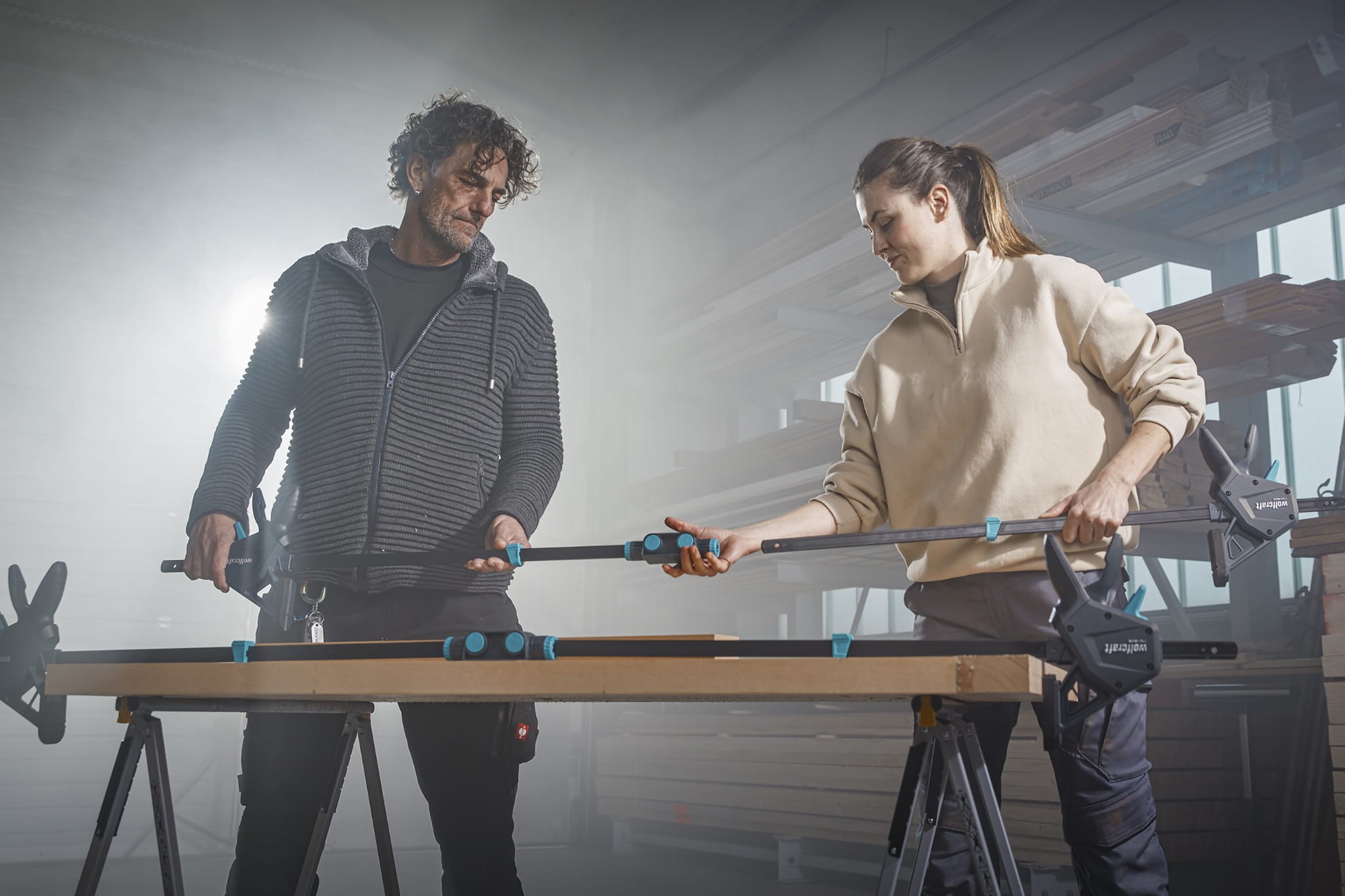 - Opatentowany adapter z przełącznikiem obrotowym, zapewniający zgodność ze ściskami jednoręcznymi wolfcraft EASY / PRO L / PRO MAX