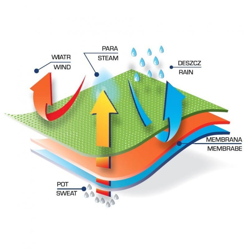 - Wstawki: z 3- warstwowej tkaniny soft-shell z membraną TPU, wodoodpornej (8000 mm), oddychającej (3000 g/m2/24h)