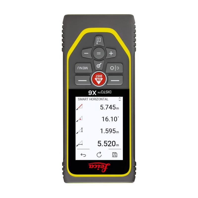 - Funkcje pomiarowe: pomiar odległości, powierzchnia/powierzchnia ścian, powierzchnia trójkąta, objętość, dodawanie, odejmowanie, pomiar ciągły, min/maks, Pitagoras, funkcja trapezowa, tyczenie, timer, pamięć wyników z funkcją wyświetlania danych szczegółowych, transmisja Bluetooth