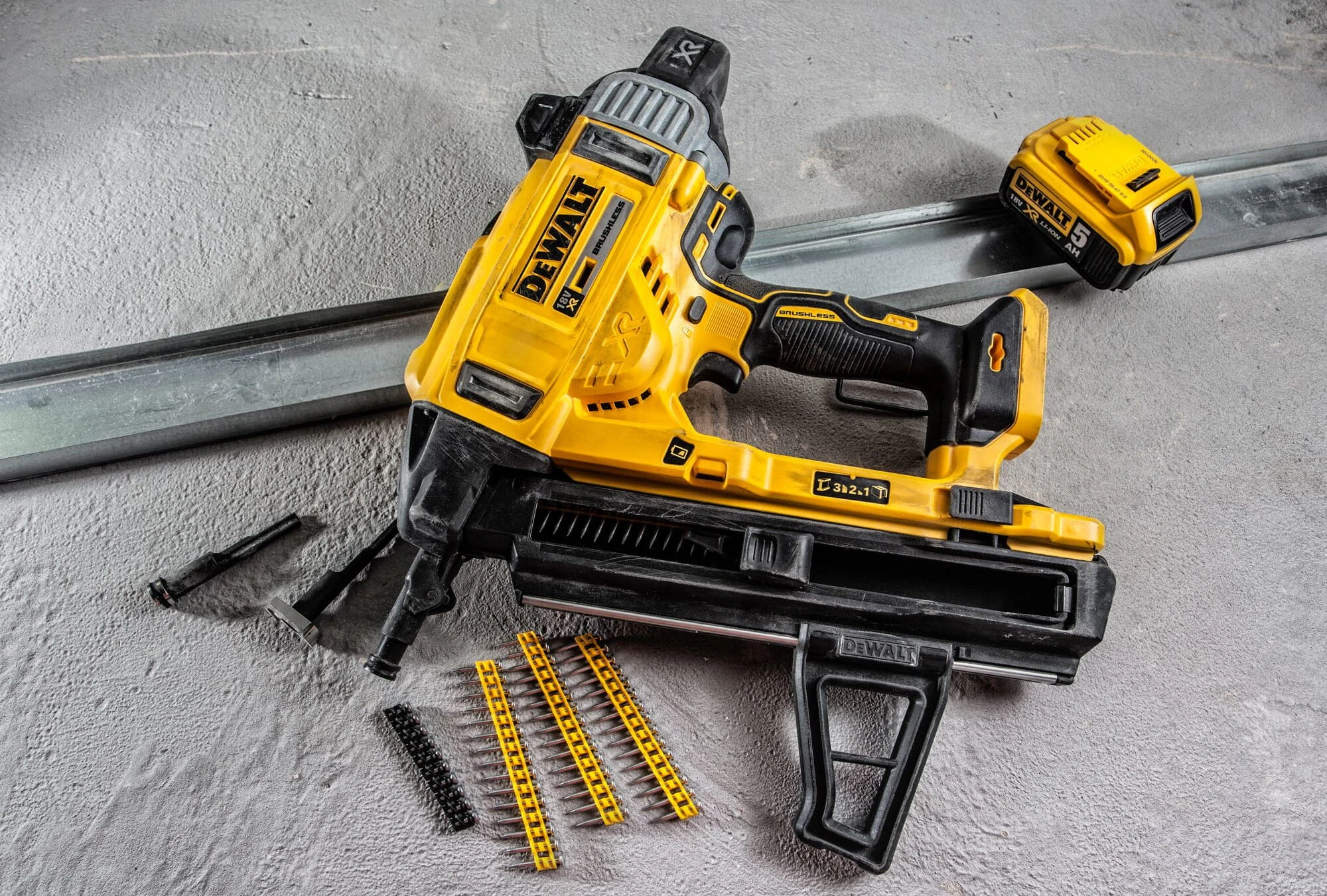 Gwoździarka do betonu wyposażona jest w akumulator litowo-jonowy 18 V XR o pojemności 5,0 Ah oraz silnik bezszczotkowy, które zapewniają wydłużony czas pracy oraz moc umożliwiającą wstrzeliwanie dłuższych gwoździ. Przy użyciu standardowych gwoździ 20 mm (średnica 2,6 mm) na w pełni naładowanym akumulatorze można wykonać aż 600 strzałów lub zamocować 245 metrów szyn do płyt kartonowo-gipsowych (gwoździe rozmieszczone co 40 cm).
