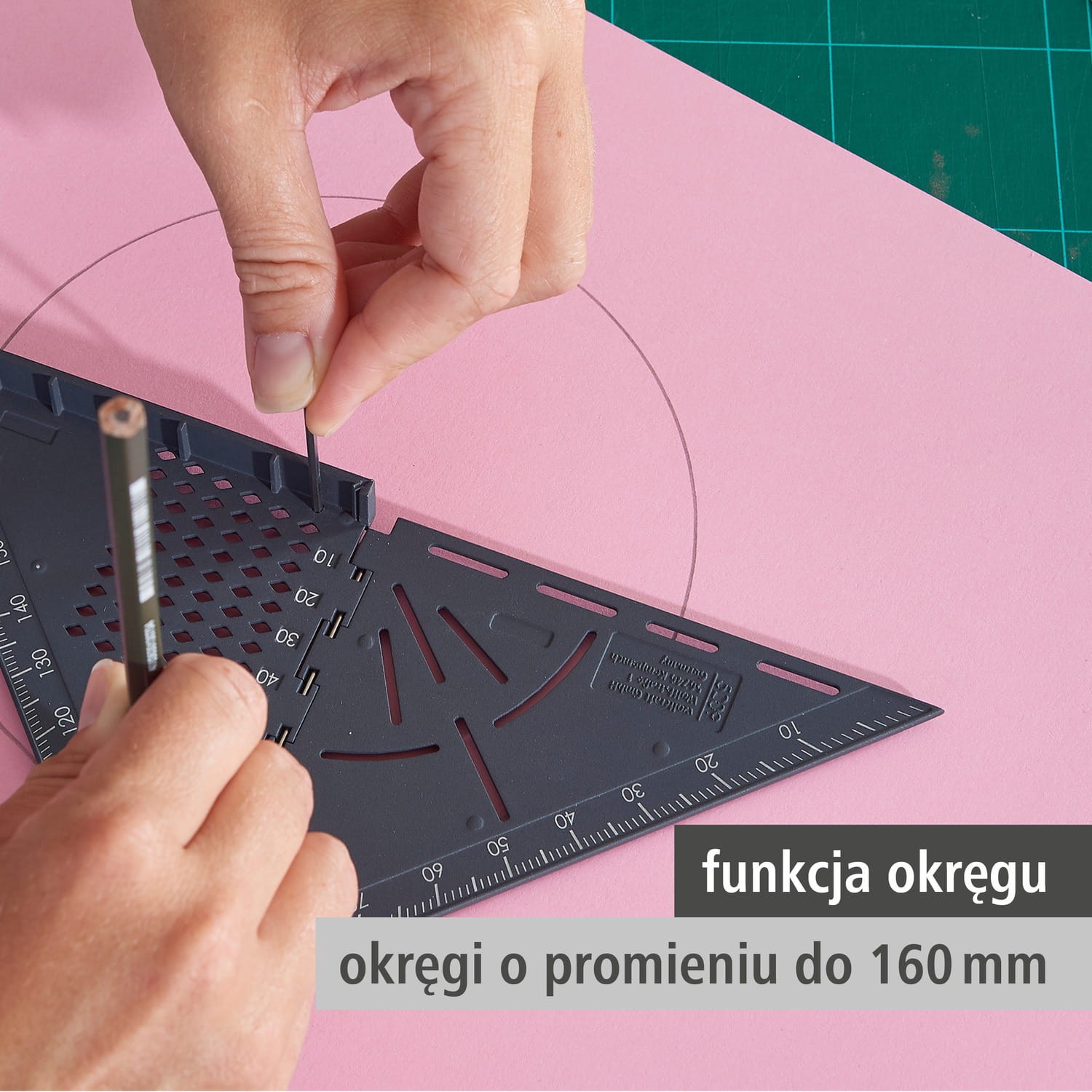 - Milimetrowa skala, ograniczniki dla kątów 45° i 90° oraz skala dla dowolnych kątów od 0 do 180° umożliwiają precyzyjne wyrównanie i znakowanie.