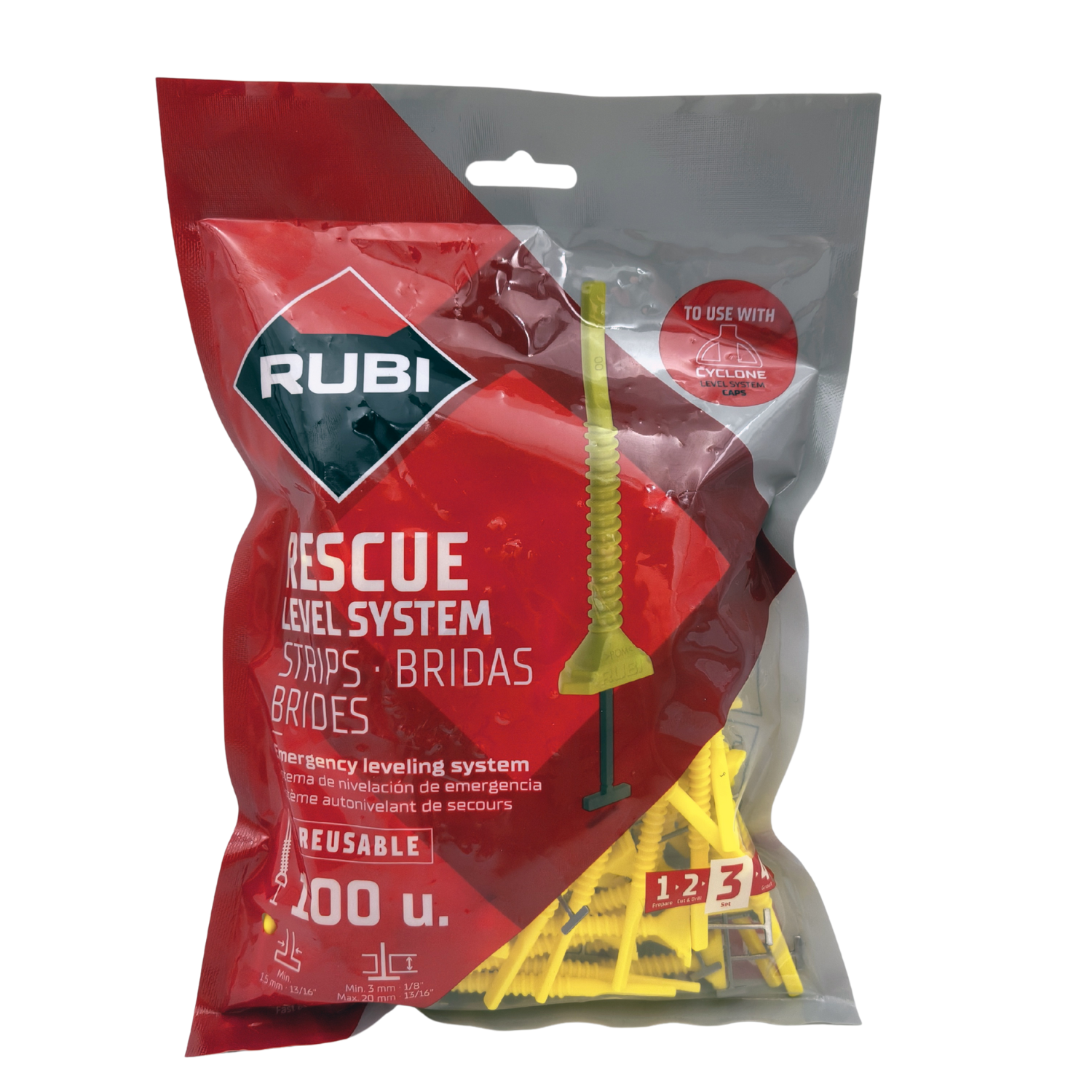 Instalacja klipsa RESCUE REUSABLE jest szybka i prosta dzięki strzałkowatej podstawie, która wskazuje prawidłowe położenie, oraz szerokiej powierzchni chwytu zacisku. Produkt jest zgodny z systemem poziomowania Cyclone i nadaje się do płytek o grubości od 3 do 20 mm, umożliwiając minimalne spoiny o szerokości 1,5 mm i zapewniając doskonałe wykończenie wszystkich rodzajów projektów.