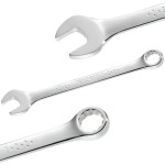 Główka klucza oczkowego ma 12-kątny kształt i jest wygięta pod kątem 15°. Główka płaska również wygięta jest pod kątem 15° względem osi rękojeści, co daje kąt powrotu wynoszący 30°. Profil oczka został zaprojektowany tak, aby maksymalizować powierzchnię kontaktu z nakrętką, co zapewnia zwiększoną trwałość narzędzia. Klucz jest kuty ze stali chromowo-wanadowej, a jego powierzchnia jest chromowana i błyszcząca. Spełnia normy ISO 691, ISO 1711-1, ISO 3318, ISO 7738 oraz DIN 3113. Zdjęcia mają charakter poglądowy.