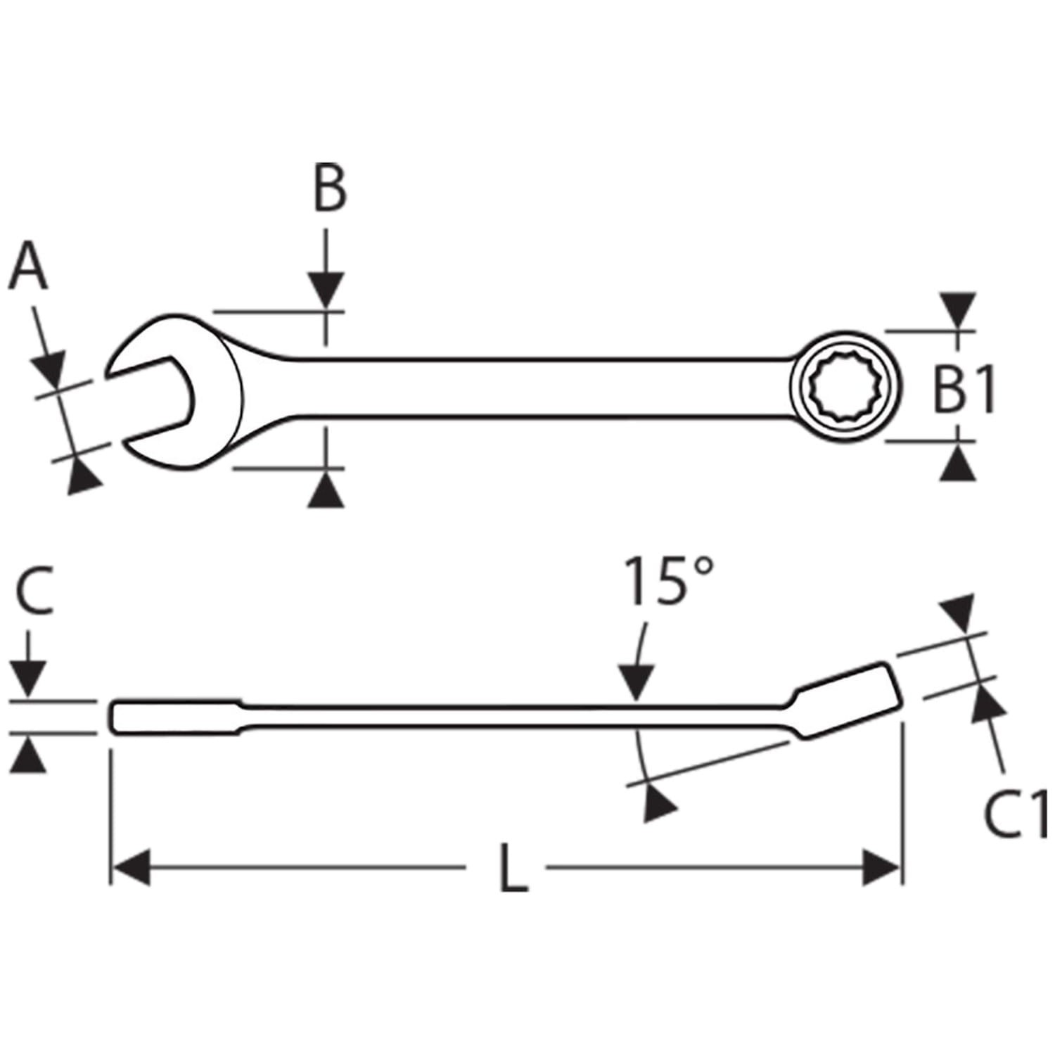 Główka klucza oczkowego ma kształt dwunastościanu i jest lekko wygięta pod kątem 15°, co umożliwia lepszy dostęp do trudno dostępnych miejsc i ułatwia pracę w ograniczonej przestrzeni. Główka płaska jest nachylona o 15° względem osi rękojeści, co daje kąt zwrotu równy 30°, co pozwala na bardziej efektywne i szybkie obracanie nakrętek lub śrub w wąskich przestrzeniach. Profil oczka został zaprojektowany w taki sposób, aby maksymalizować kontakt z nakrętką, co zapewnia lepszą trwałość i redukuje ryzyko uszkodzenia narzędzia oraz elementu mocującego. Klucze te są wykonane z wysokiej jakości stali chromowo-wanadowej, która charakteryzuje się dużą wytrzymałością i odpornością na ścieranie, a ich powierzchnia jest pokryta błyszczącym chromem, co zwiększa ochronę przed korozją i nadaje estetyczny wygląd.