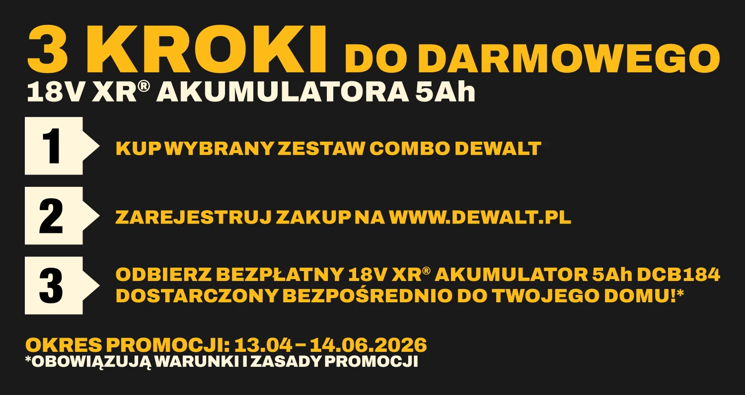 Wybierz jeden z zestawów Combo DEWALT objętych promocją i dokonaj zakupu w okresie jej trwania, czyli od 13.04.2026 do 14.06.2026. Ważne – tylko modele wskazane w regulaminie kwalifikują się do akcji.