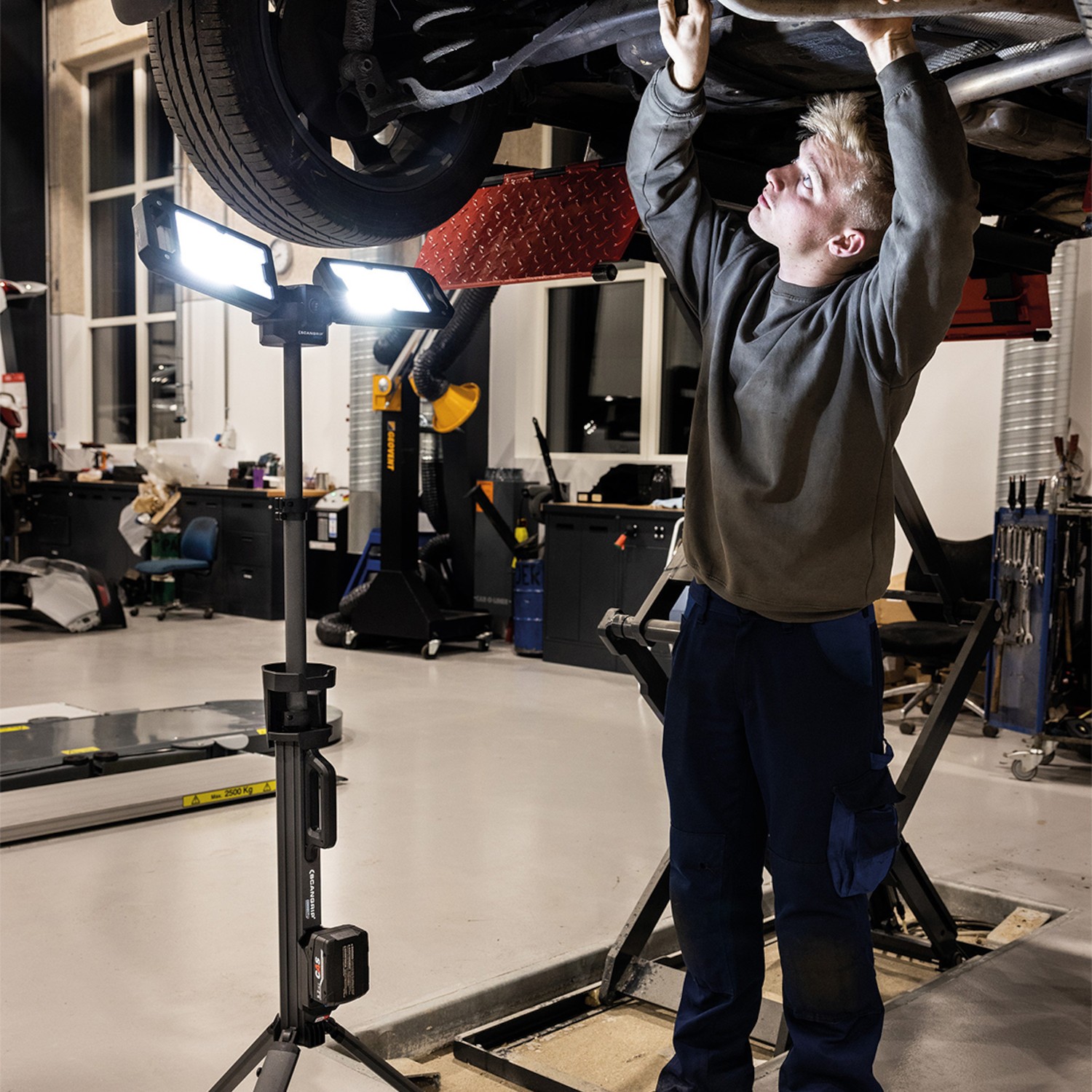 Dzięki obrotowym reflektorom 360°, możliwe jest precyzyjne ustawienie kierunku światła w zależności od potrzeb, a dwustopniowa regulacja jasności (50% / 100%) pozwala na optymalne dostosowanie natężenia światła do wykonywanych zadań. Statyw rozkłada się do wysokości 2 metrów, a dzięki systemowi szybkiego składania QUICK-FOLD i wadze zaledwie 5,2 kg, urządzenie jest łatwe w transporcie i przechowywaniu.