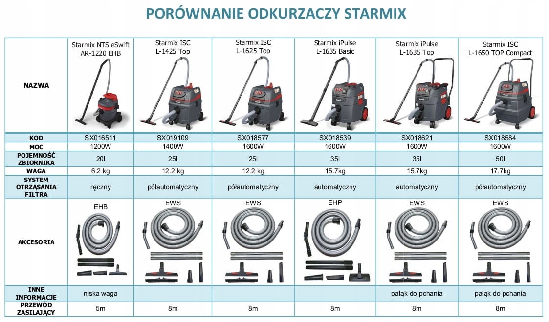 Starmix ISC L-1625 Top to profesjonalny odkurzacz przemysłowy klasy „L” zaprojektowany z myślą o intensywnym użytkowaniu w wymagających warunkach — w przemyśle, warsztatach oraz na placach budowy. Wyposażony w potężną turbinę wysokiej wydajności oraz system automatycznego, elektromagnetycznego czyszczenia filtra impulsami (podczas przerw w pracy), gwarantuje niezmiennie wysoką moc ssania i skuteczne usuwanie pyłu nawet w najtrudniejszych zastosowaniach.