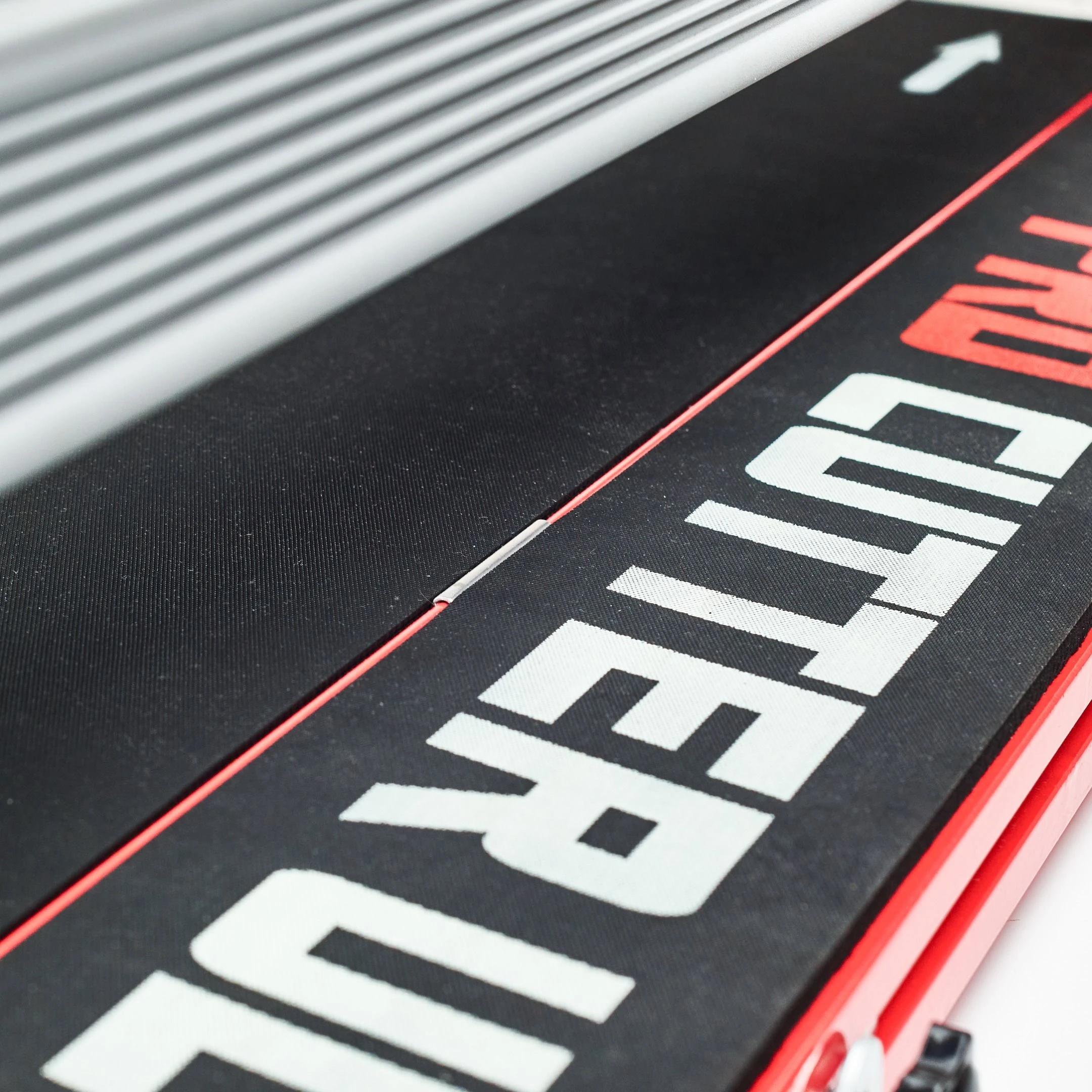 Solidna konstrukcja przecinarki zapewnia wyjątkową stabilność podczas pracy. Jej sztywne blaty oraz trzy boczne podpory (każda o długości 70 cm od osi kółka tnącego) gwarantują pewne podparcie nawet przy dużych formatach płytek. Cała konstrukcja szyny opiera się na dwóch kluczowych komponentach – aluminiowym profilu usztywniającym oraz precyzyjnej prowadnicy inspirowanej rozwiązaniami znanymi z obrabiarek CNC. Taki układ zapewnia trwałość, sztywność oraz dokładność prowadzenia wózka tnącego.