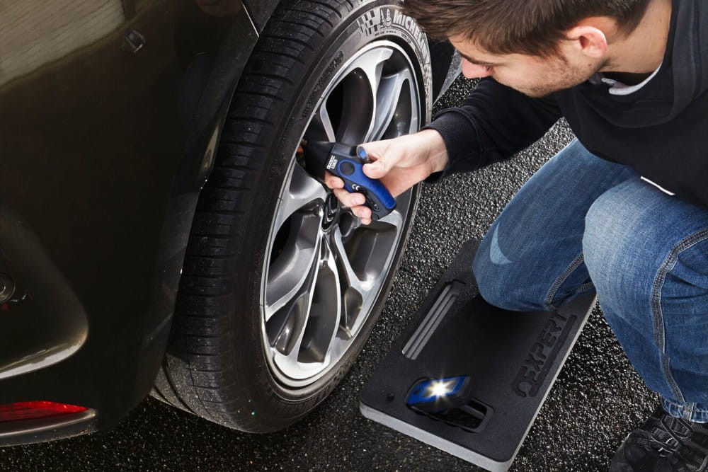- Wbudowany głębokościomierz z podziałką od 0 do 20 mm do oceny zużycia opon