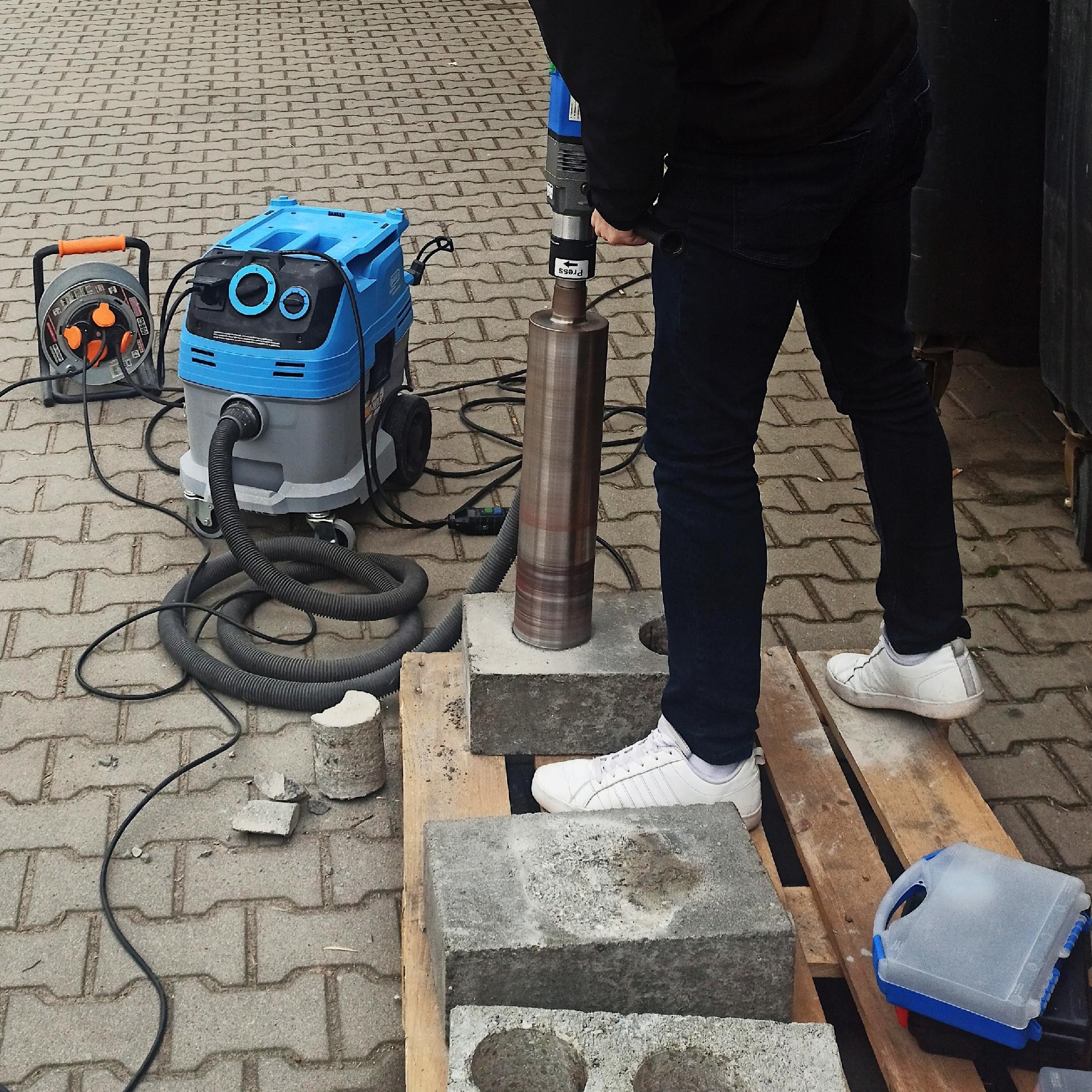 - Dokładne odwierty w żelbecie bez odprysków, od 60 do 200 mm. Szybko wymienialny adapter sucho/mokro.