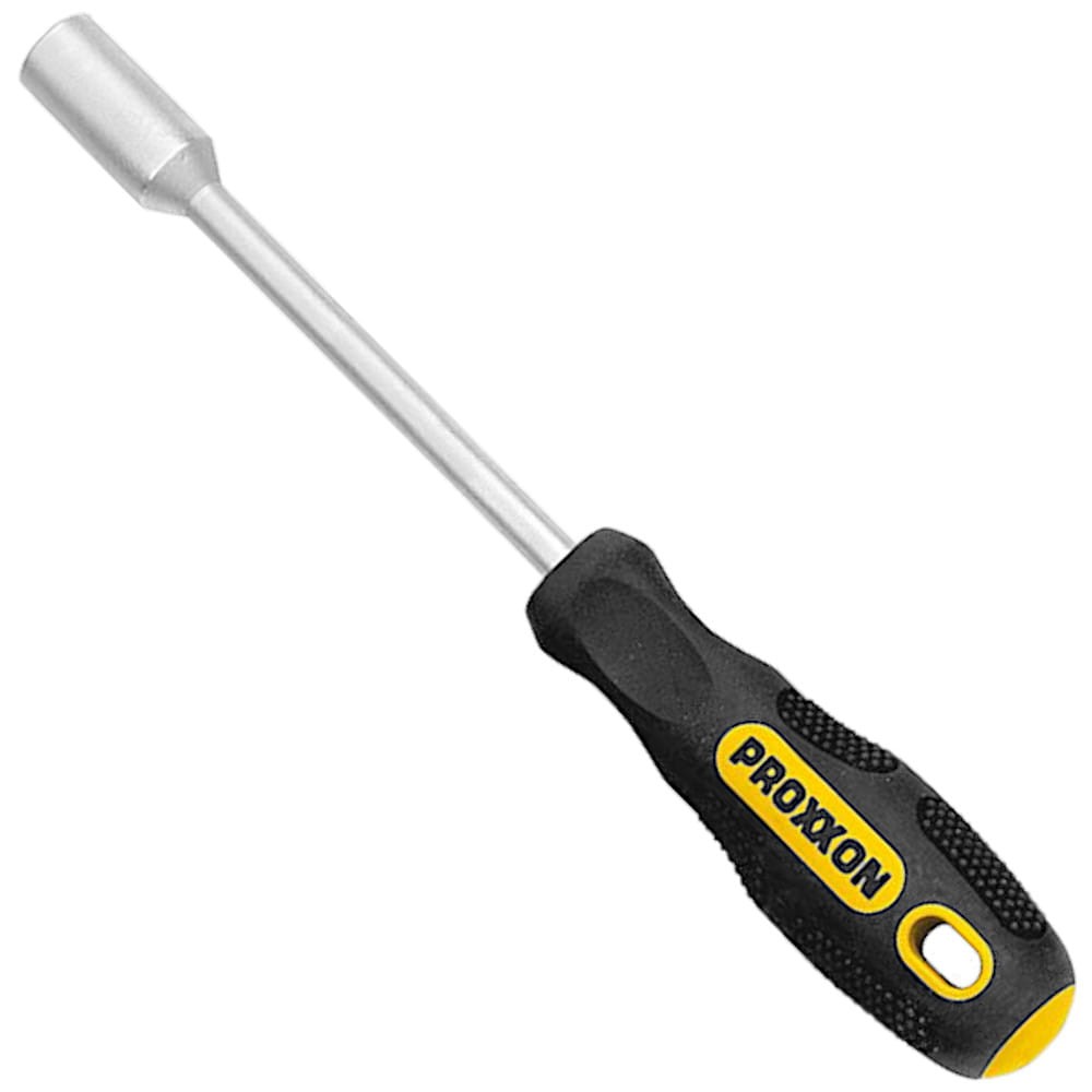 Wkrętak nasadowy Proxxon to narzędzie, które łączy w sobie ergonomię, trwałość i precyzję. Posiada zaokrągloną, dwukomponentową rękojeść „FLEX-DOT”, która została zaprojektowana z myślą o wygodzie użytkownika, ograniczając zmęczenie dłoni podczas pracy i umożliwiając osiąganie wysokich momentów obrotowych w różnych pozycjach. Rękojeść jest odporna na oleje i kwasy, a jej powlekana powierzchnia zapewnia pewny chwyt i stabilność. Wkrętak wyposażono w otwór do zawieszania, co ułatwia przechowywanie.