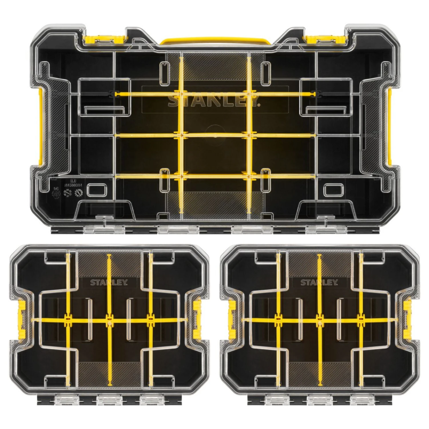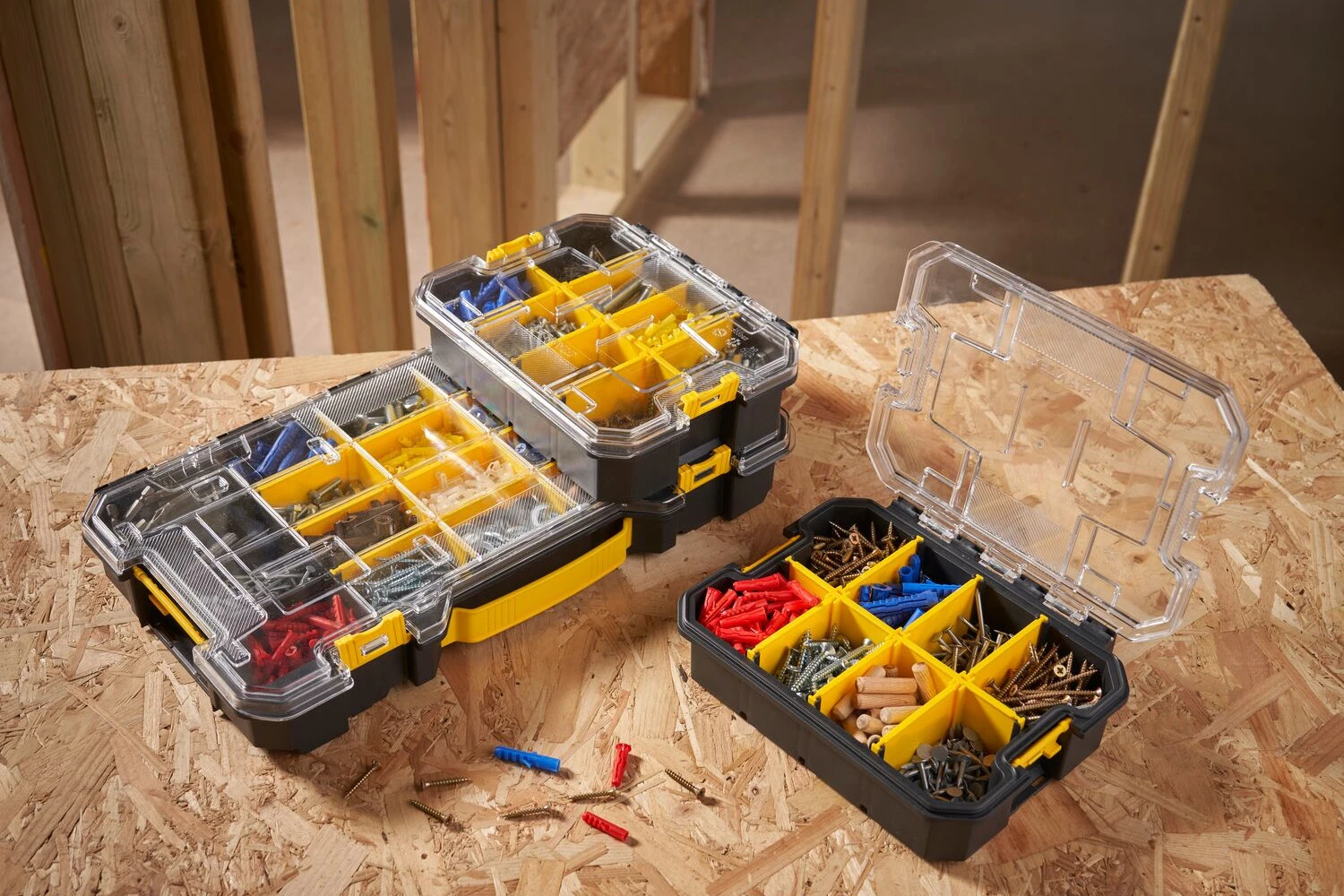 Konstrukcja organizerów umożliwia ich stabilne układanie jeden na drugim, co zwiększa wygodę użytkowania i pozwala zaoszczędzić miejsce zarówno w warsztacie, jak i podczas transportu.